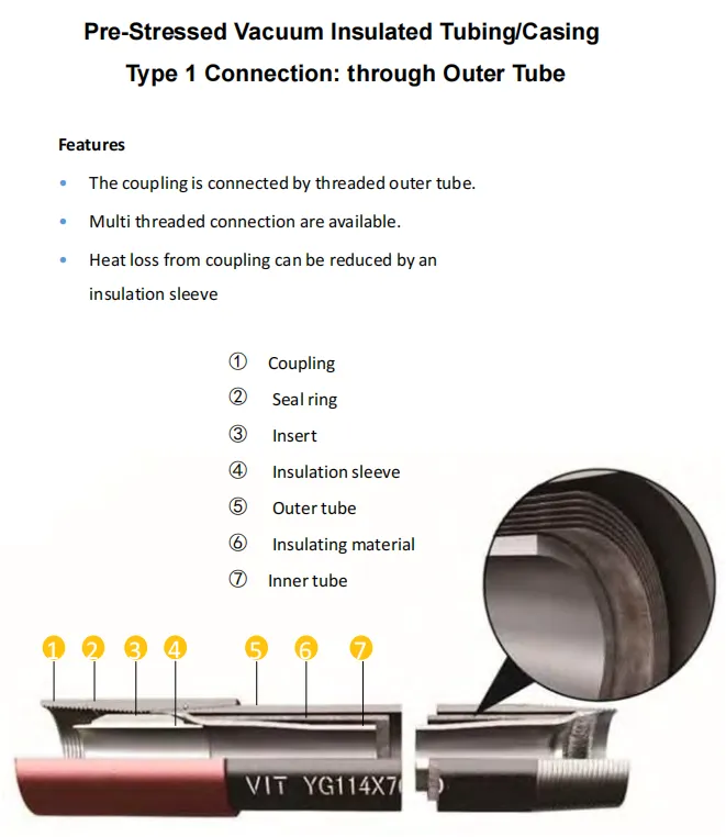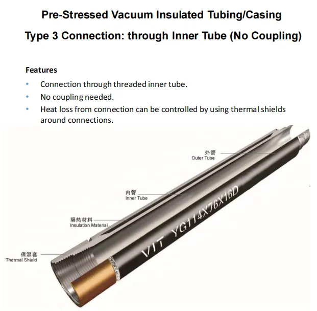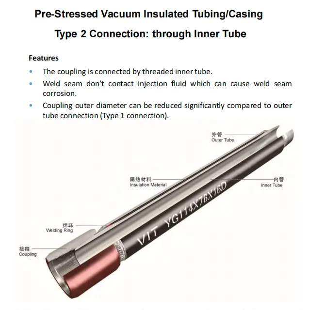 The Pre-stressed Vacuum Insulated Tubing/Casing is innovative Tubing/Casing for thermal recovery of heavy oil or bitumen. It is used in Steam Assisted Gravity Drainage (SAGD) and In Cyclic Steam Stimulation (CSS). It reduces the heat loss of the high temperature steam during injection phase. And keep oil hot during production phase. The build-in pre-stress feature can compensate the thermal stress on tubing/casing induced from hot steam, prevent the casing and cement mantle damage from high temperature, and increase tubing casing service life.