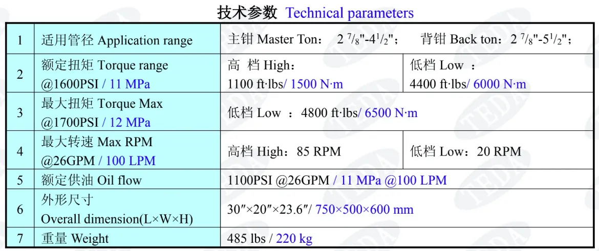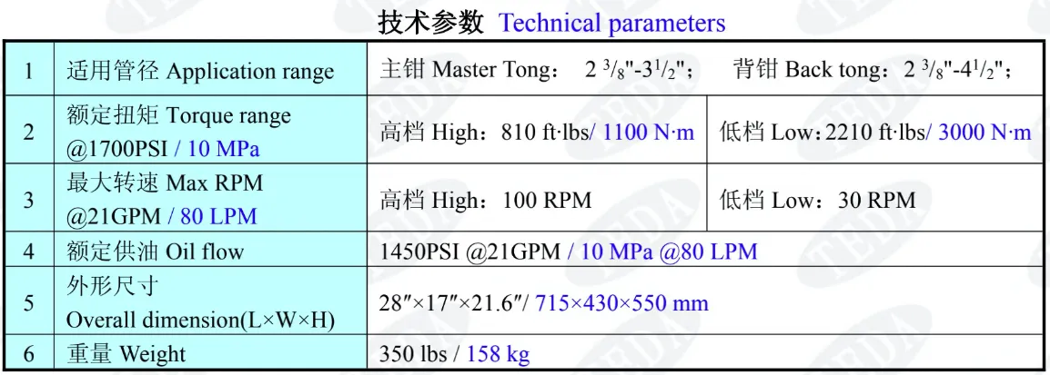 - The tong is made up of master tong and backup tong, the master tong has a high and low gear train, the tong is compact, light and efficient.