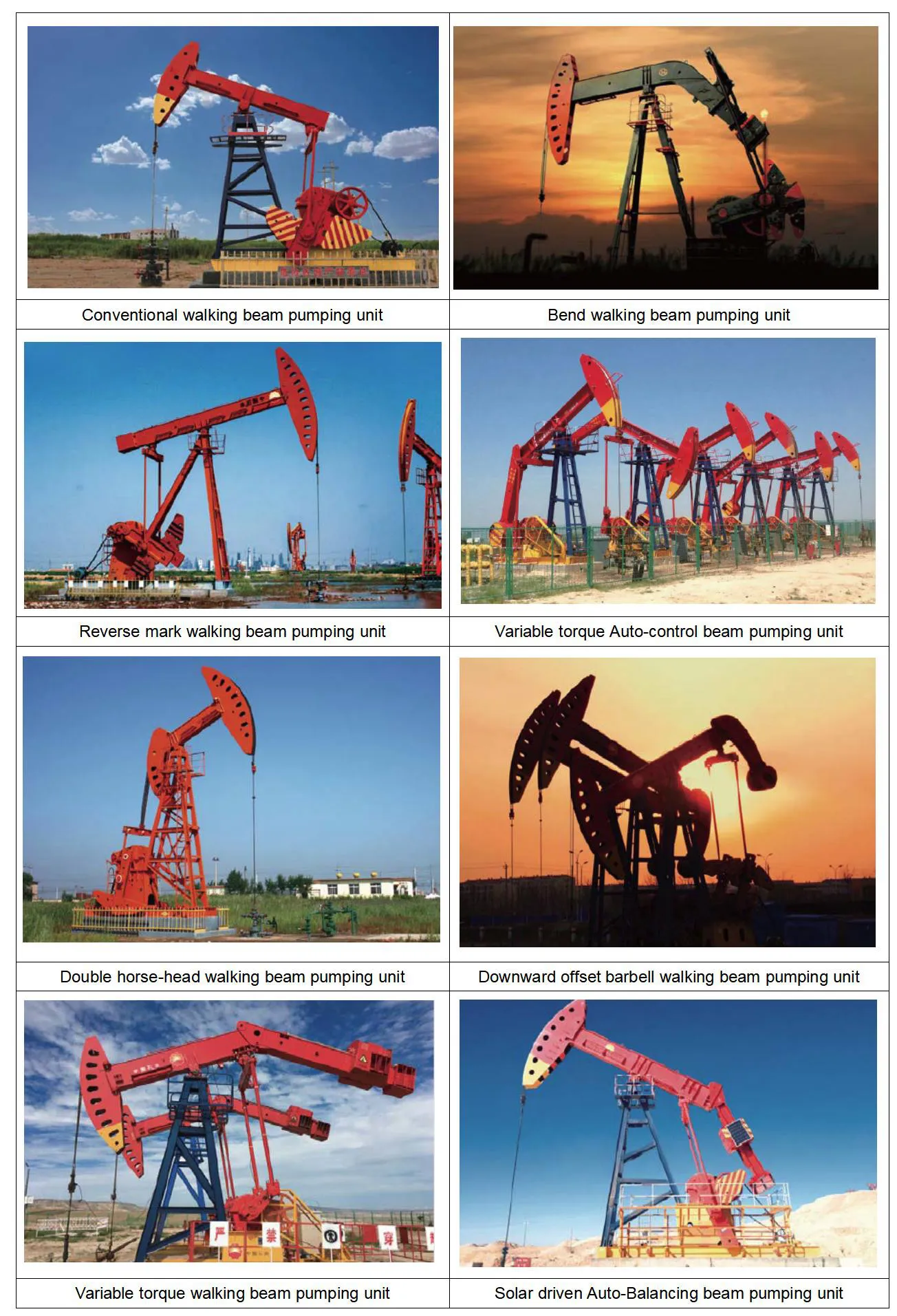 The main Beam pumping unit products are conventional walking beam pumping unit,bend walking beam pumping unit,double horse-head beam pumping unit, downward offset barbell walking beam pumping unit,reverse mark walking beam pumping unit, variable torque walking beam pumping unit, complex magneto electric motor pumping unit, solar driven Auto-balancing beam pumping unit etc.